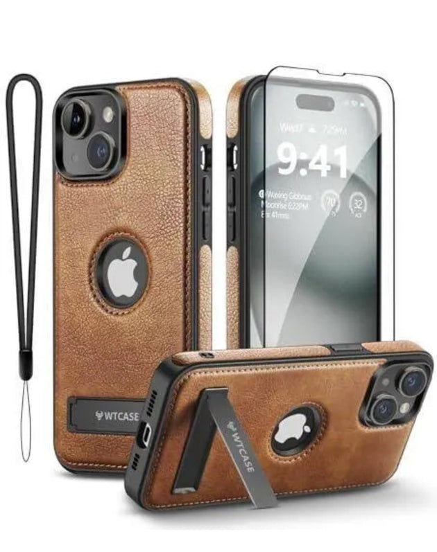 iPhone 15 15 plus 15 pro 15 pro max case kickstand leather brown back cover case