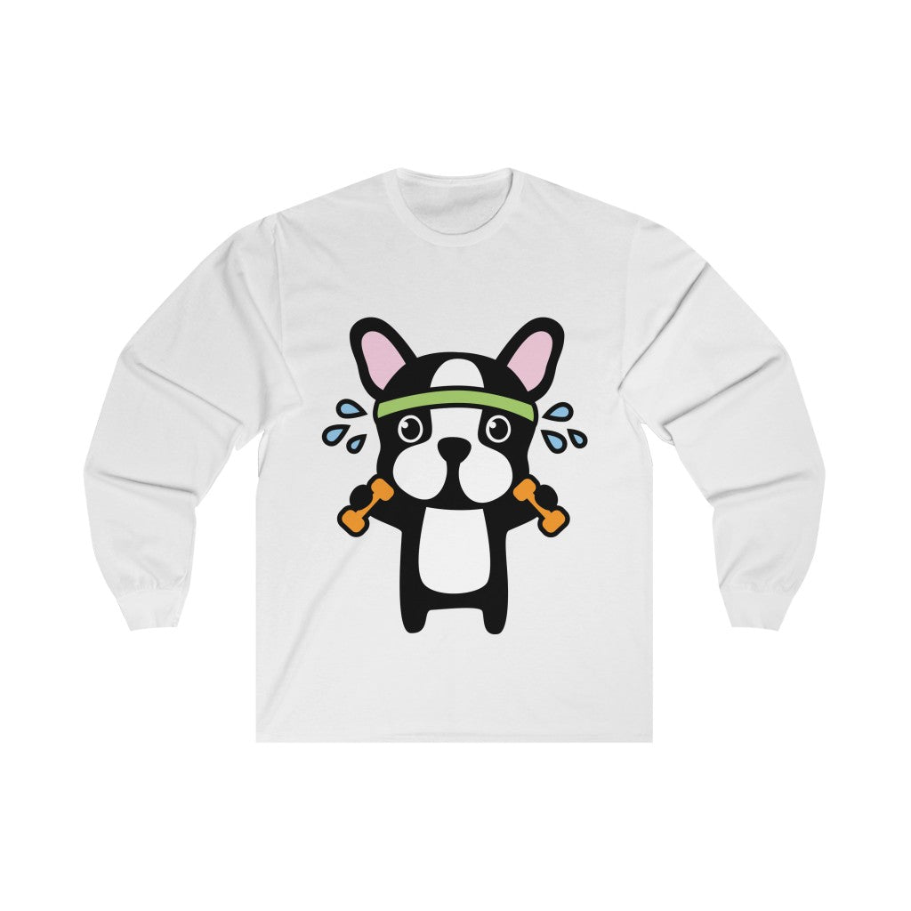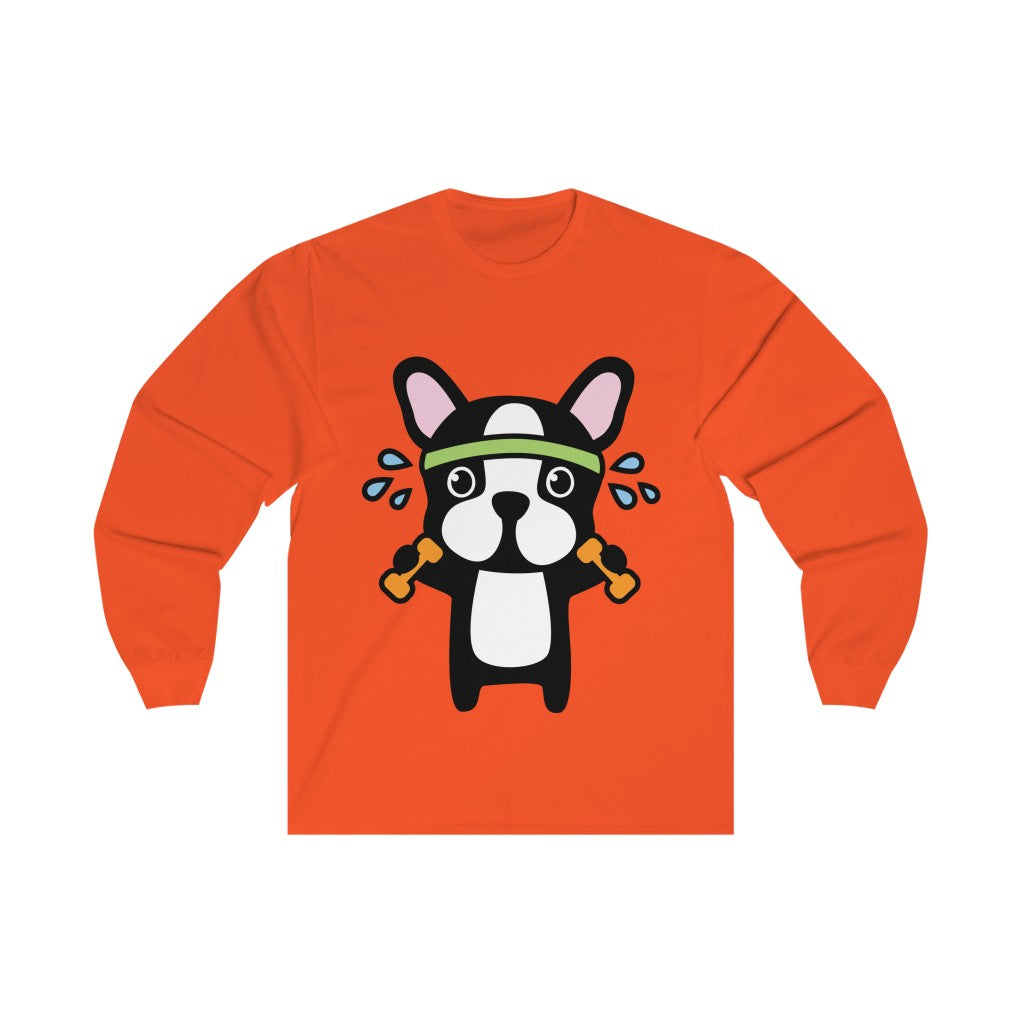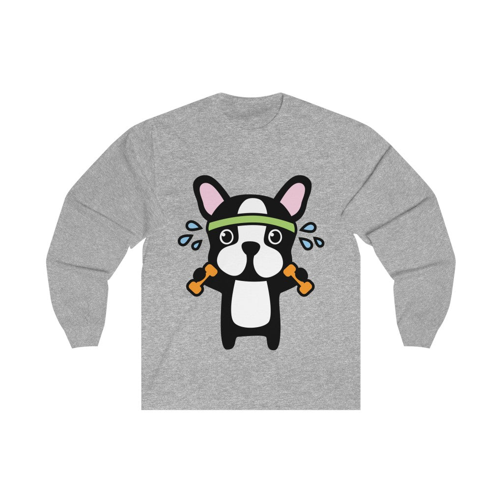 Men long sleeve shirt with workout bull dog. This long sleeve is both cozy and stylish. Preshrunk 100% cotton tee with high quality print will serve as a style statement for years to come.