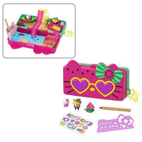 The outside of the pencil case features an iconic Hello Kitty design with a stylish watermelon twist. Open for a beach-themed playset with fun features like a swinging hammock, glitter slide, and more!